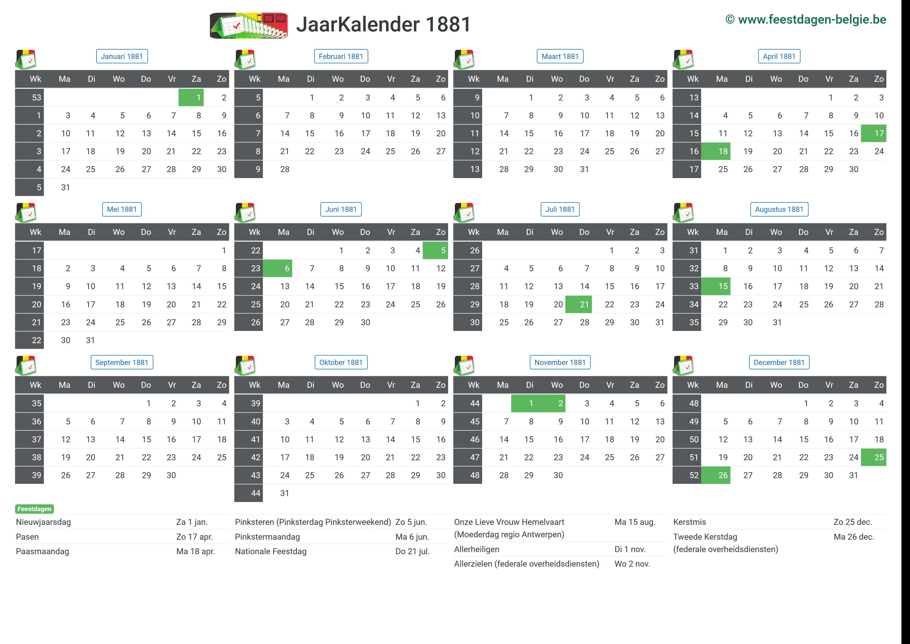 thumbnail jaarkalender voor het jaar 1881 in papierformaat A4 Staand Landscape en bestandsformaat PDF Adobe Acrobat met Feestdagen België