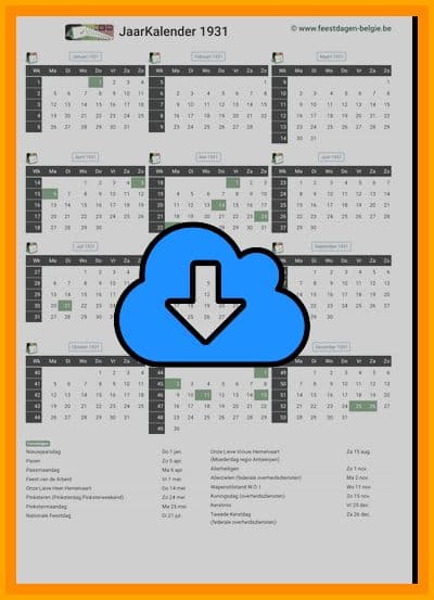 thumbnail jaarkalender voor het jaar 1931 in papierformaat A4 Liggend Landscape en bestandsformaat PDF Adobe Acrobat met Feestdagen België