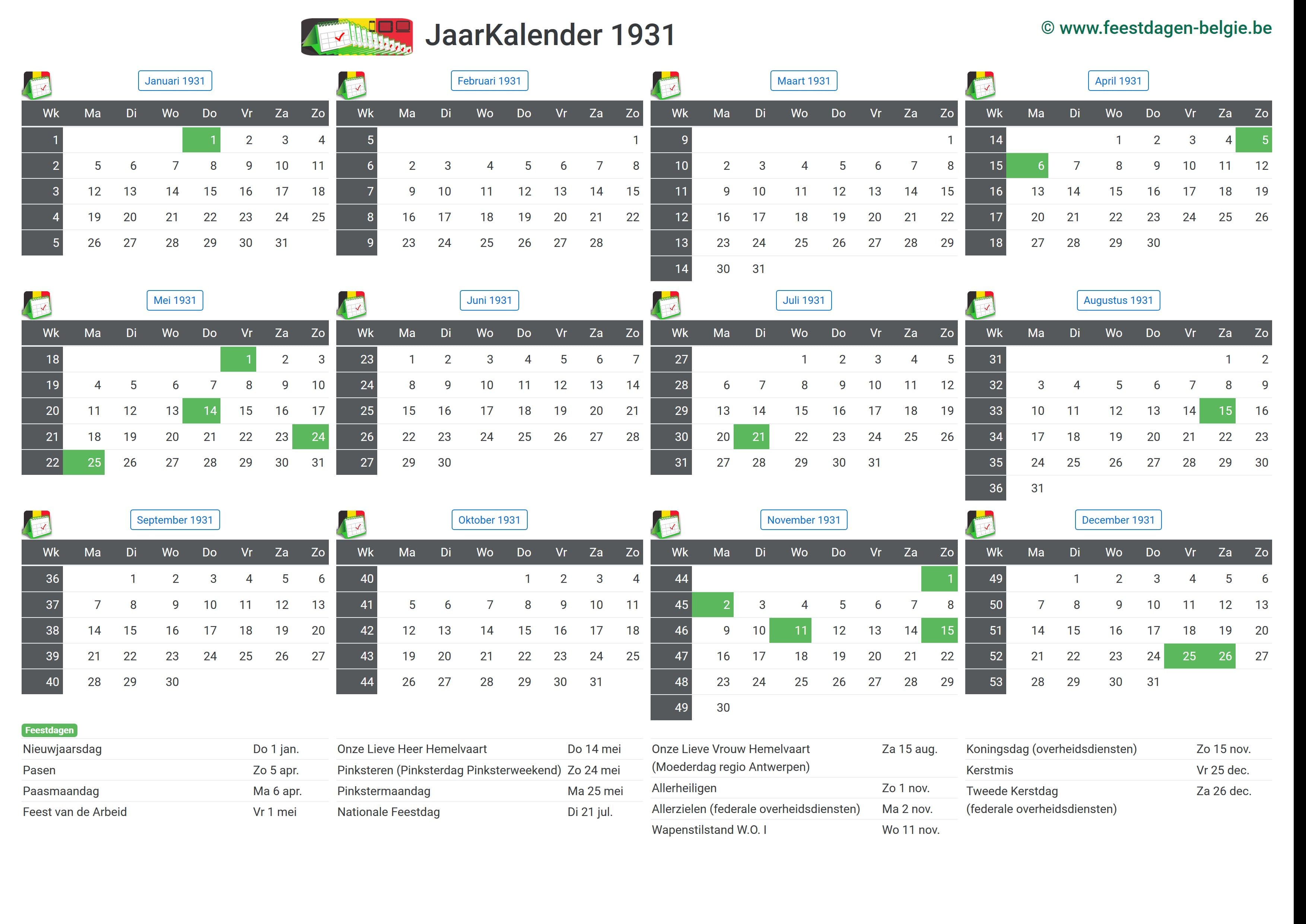 thumbnail jaarkalender voor het jaar 1931 in papierformaat A4 Staand Landscape en bestandsformaat PDF Adobe Acrobat met Feestdagen België