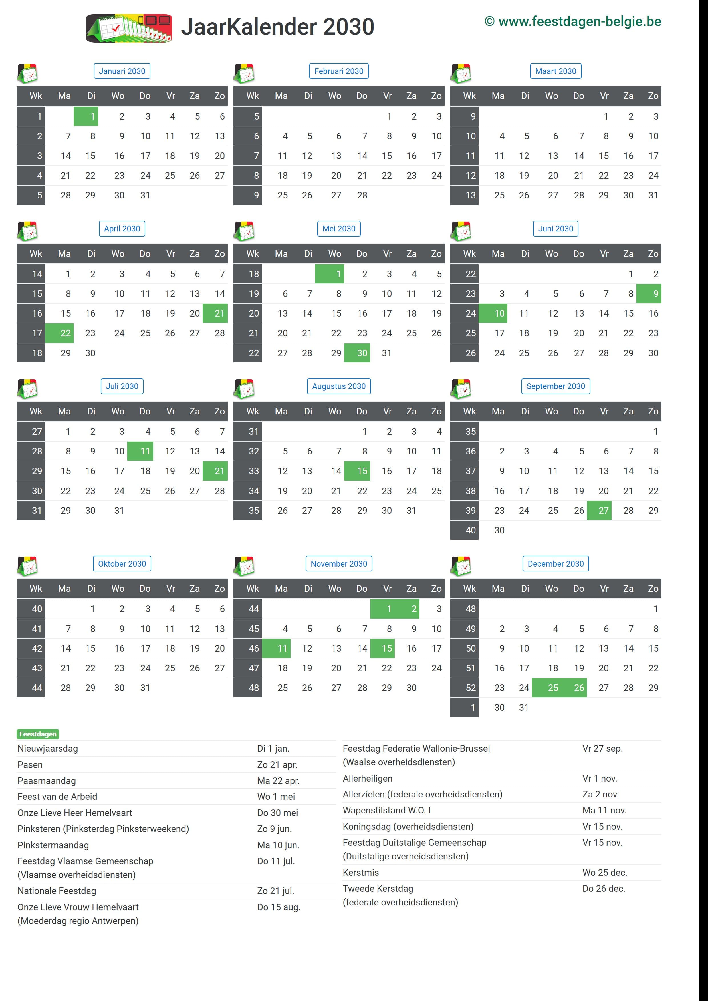 Onder de maandkalender kan je deze kalender downloaden (en printen in hoge kwaliteit) en worden ook de Belgische feestdagen, Belgische verlengde weekends, Vlaamse schoolvakanties en Belgische speciale dagen netjes opgelijst (als die beschikbaar zijn voor die maand).