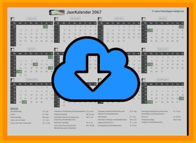 thumbnail jaarkalender voor het jaar 2067 in papierformaat A4 Liggend Landscape en bestandsformaat PDF Adobe Acrobat met Feestdagen België