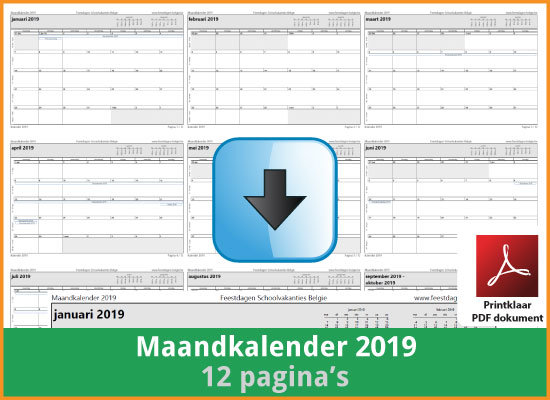 Deze populaire maandkalenders op papierformaat A4 Portrait en A4 Landscape tonen de exacte weeknummers en de lijst van datums van de Belgische feestdagen. Sommige kalenders tonen ook de schoolvakanties van Belgie.Deze kalenders hebben 12 pagina’s, en elke pagina toont 1 maand.